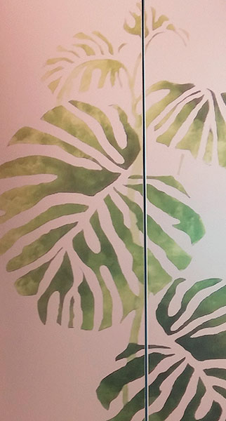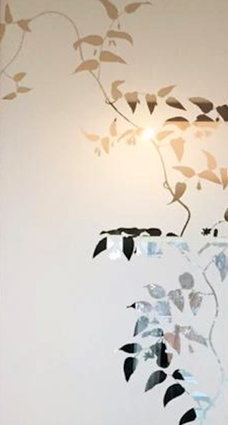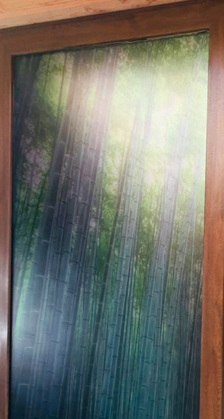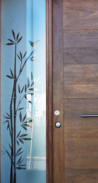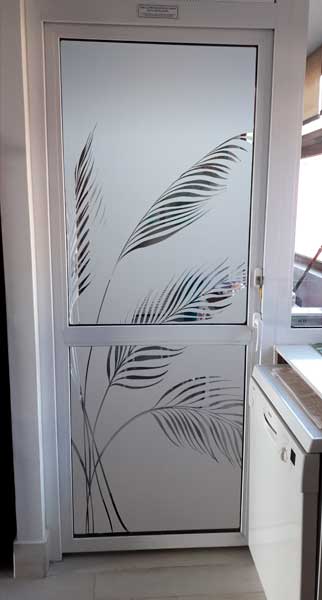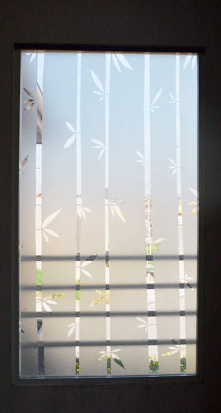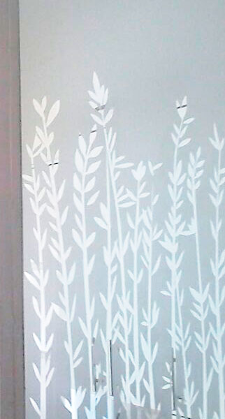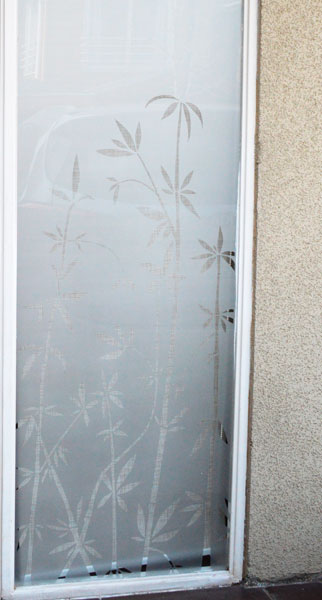 Empavonado puerta patio. Diseño Bambú, Instalación interior cortada en figuras de enredaderas bambú. Código Cb-07