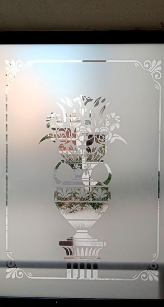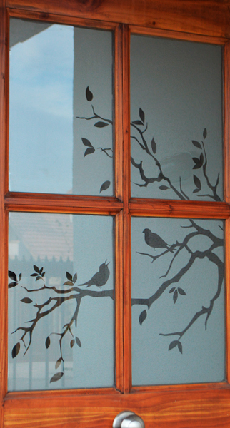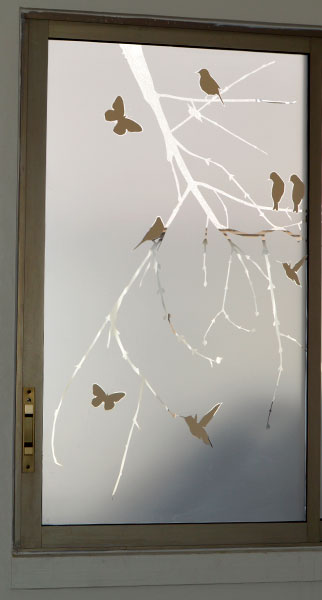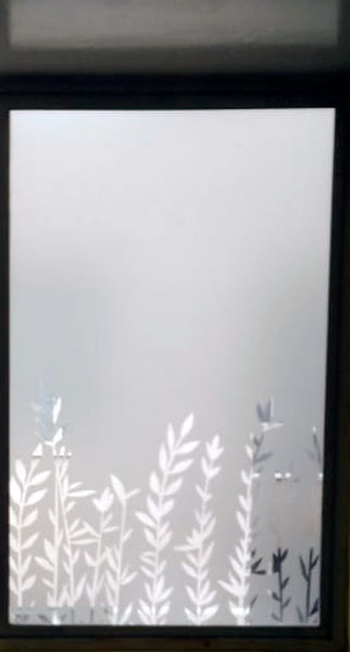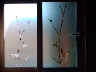 Empavonado ventana dormitorio. Diseño ramitas y flor, Instalación interior. Código Cb-09