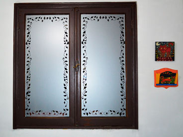 Empavonado ventana cocina. Diseño e Instalación interior cortada en figuras de hojas contínuas. Código Cb-69