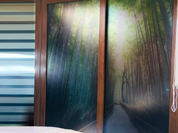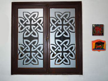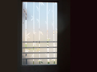 Empavonado ventanal cocina - logia. Diseño e Instalación interior cortada en figuras de bambú. Código Cb-06