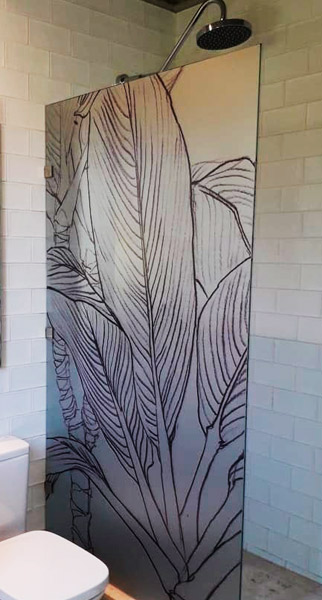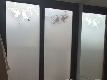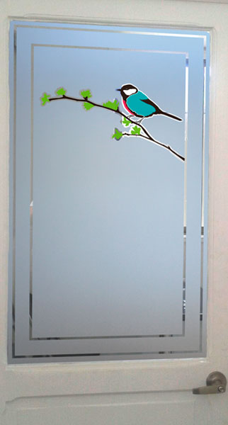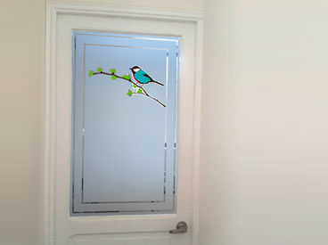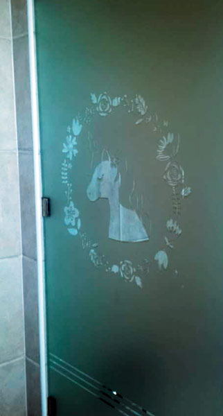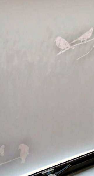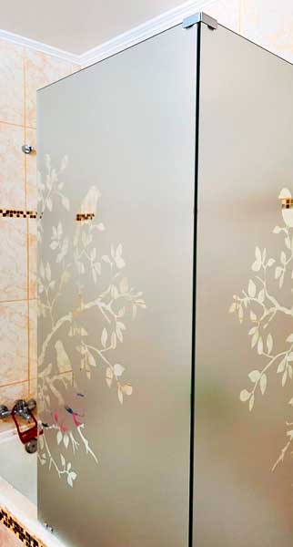 Empavonado baño shower door, diseño pajaritos. Diseño e Instalación interior aplicación de calor. Código Cb-68