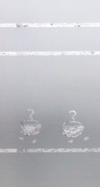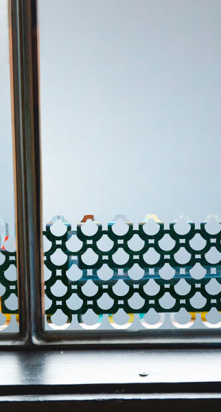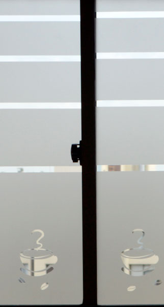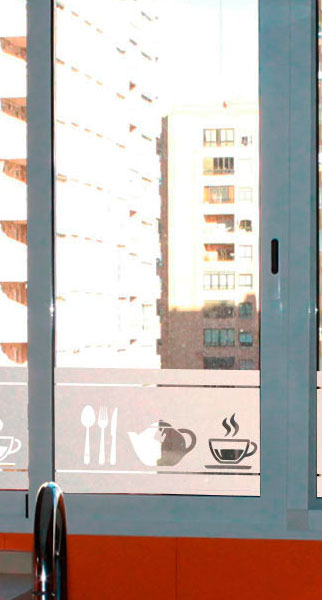 Empavonado ventana dormitorio. Diseño e Instalación interior cortada en figuras de tazas. Código Cb-04